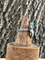 Set in sterling silver with beaded detailing and a floral-stamped band, this ring blends feminine tones with classic western craftsmanship. It has presence on the hand while still feeling light, wearable, and full of charm.