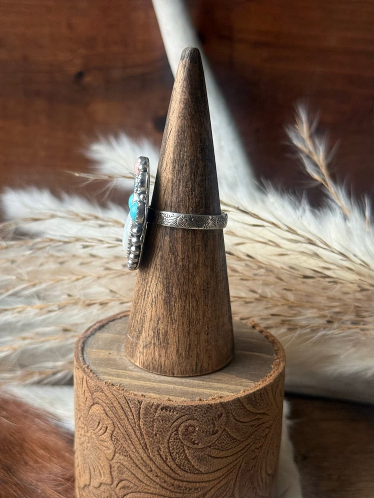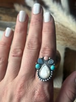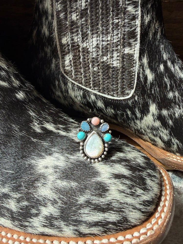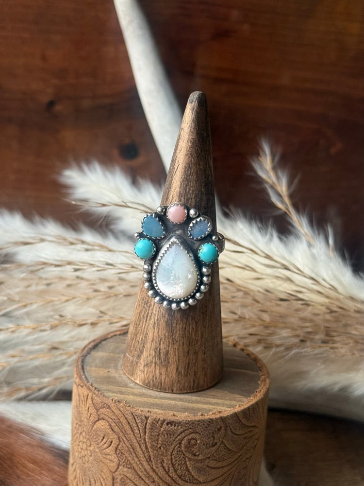 Details: A one-of-a-kind cluster ring featuring a soft, luminous freshwater pearl at the center, surrounded by a mix of pink conch, Australian opal, and vibrant turquoise. Each stone is hand-set in sterling silver and finished with subtle beadwork, creating a floral-inspired design full of color and texture.